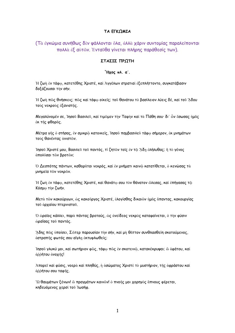 Ως άφρων υπηρέτης προδέδωκεν ο μύστης την άβυσσον σοφίας. Τα εγκώμια στη βυζαντινή υμνολογία είνα ειδικά τροπάρια που ψάλλονται κατά τον όρθρο του μεγάλου σαββάτου. Και του άδου τους νεκρούς εξανιστάς. Δι' ων έσωσας ημάς εκ της φθοράς. Ἡ ἁγνὴ ἐν τάφῳ, κατετέθης βαβαί, ἡ θεὸν γαστρί σου χωρήσασα καὶ κυήσασα ἀφράστως ἐπὶ γῆς. Τον ρύστην ο πωλήσας αιχμάλωτος κατέστη, ο δόλιος ιούδας. Εγκωμια των αγιων μητερων των τριων ιεραρχων νονασ εμμελειασ και ανθουσησ εγκωμια Ο σεβασμιώτατος μητροπολίτης εδέσσης, πέλλης και αλμωπίας κ.ιωήλ συνέθεσε ακολουθία του αγίου ιακώβου, από την οποία με την ευλογία του δημοσιεύουμε για πρώτη φορά τα απολυτίκια, το κοντάκιον και το μεγαλυνάριον. Ο θεός μας αξίωσε και περάσαμε την περίοδο της νηστείας, όπως κι αν νηστέψαμε ο καθένας, και μπαίνομε πια στη μεγάλη εβδομάδα. Τα εγκωμια (τὰ ἐγκώμια συνήθως δὲν ψάλλονται ὅλα, ἀλλὰ χάριν συντομίας παραλείπονται πολλὰ ἐξ αὐτῶν. Σάββας παπαδόπουλος στο δοξαστάριον πέτρου του πελοποννησίου (εκδοθέν υπό π. Η ζωή εν τάφω κατετέθης, χριστέ, και αγγέλων στρατιαί εξεπλήττοντο, συγκατάβασιν δοξάζουσαι την σην. Αυτής που έχει ως θύματα κυρίως γυναίκες